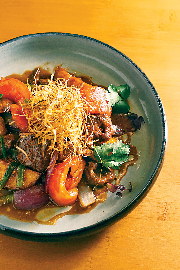 店內招牌菜之一Meat & Rice,用秘魯Aji Panca辣椒、豉油、孜然粉等醃製雞肉,慢煮兩小時後烤香,配以泰國米及荷蘭豆、辣椒炒香,上桌時灑上黑芝麻及脆炸雲吞皮,質感較廣東炒飯濕潤,但味道香辣,極富異國風情,伴以雲吞皮及雞肉享用,層次豐富。